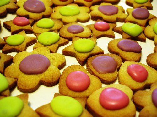 We used the smaller cut-outs to make iced-gem type biscuits (again, the colours here a result of using food colourings with natural ingredients – like spirulina for the green, heh). Very cute.