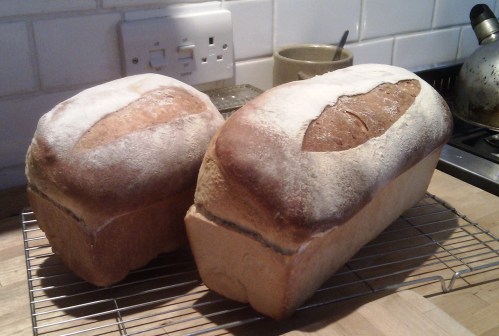 I did double quantities, and these two were baked in a long 900g (2lb) loaf tin and a standard 450g (1lb) loaf tin, but for single quantities Dan L recommends a large, deep 2lb tin.