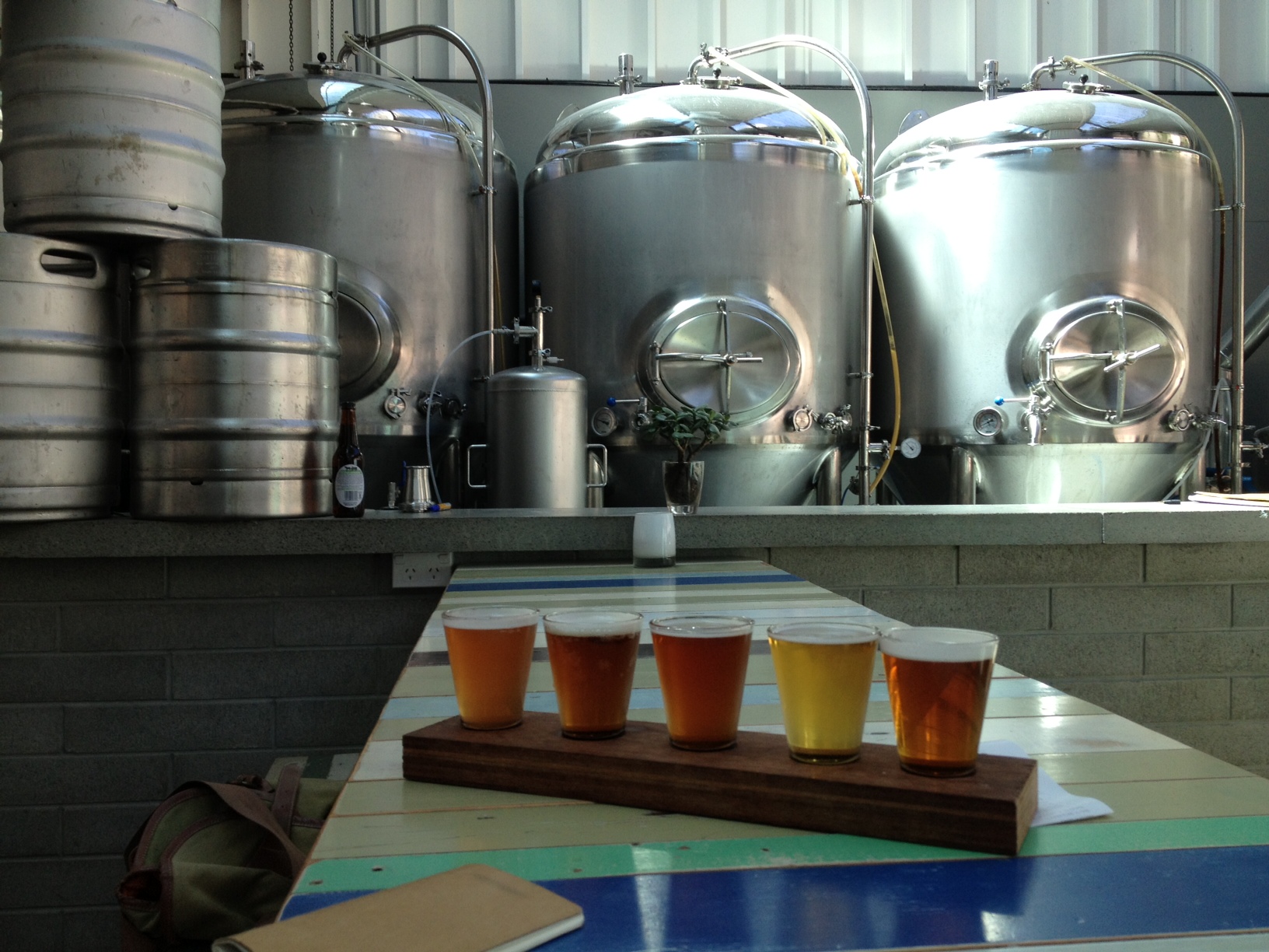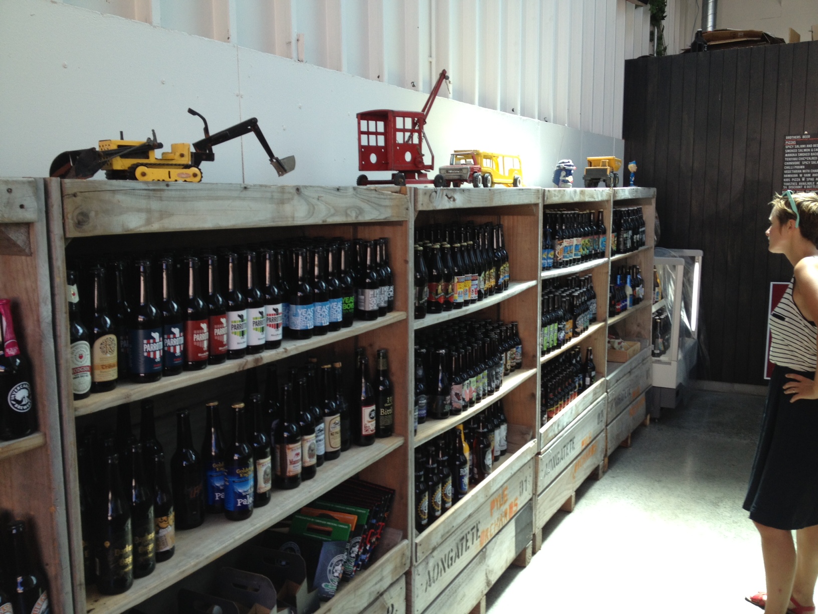 Tasting paddle at Brothers BeerShe warmed up a bit when we got chatting more about beer. We had a tastling padddle of five of their brews. Alongside their own beers – brewed, with a cloud of malty mashy odours, right there – they had some representation from other breweries, like Yeastie Boys (based in Wellington). The venue also has some slightly sagging shelves laden with bottles of genuine craft beer – so no Hancock’s, Boundary Road or Founders and plenty of Mike’s, Parrot Dog, Townsend’s, Invercargill Brewery and 8 Wired etc, and even some overseas stuff like Speakeasy, which we’d had in its native San Francisco.