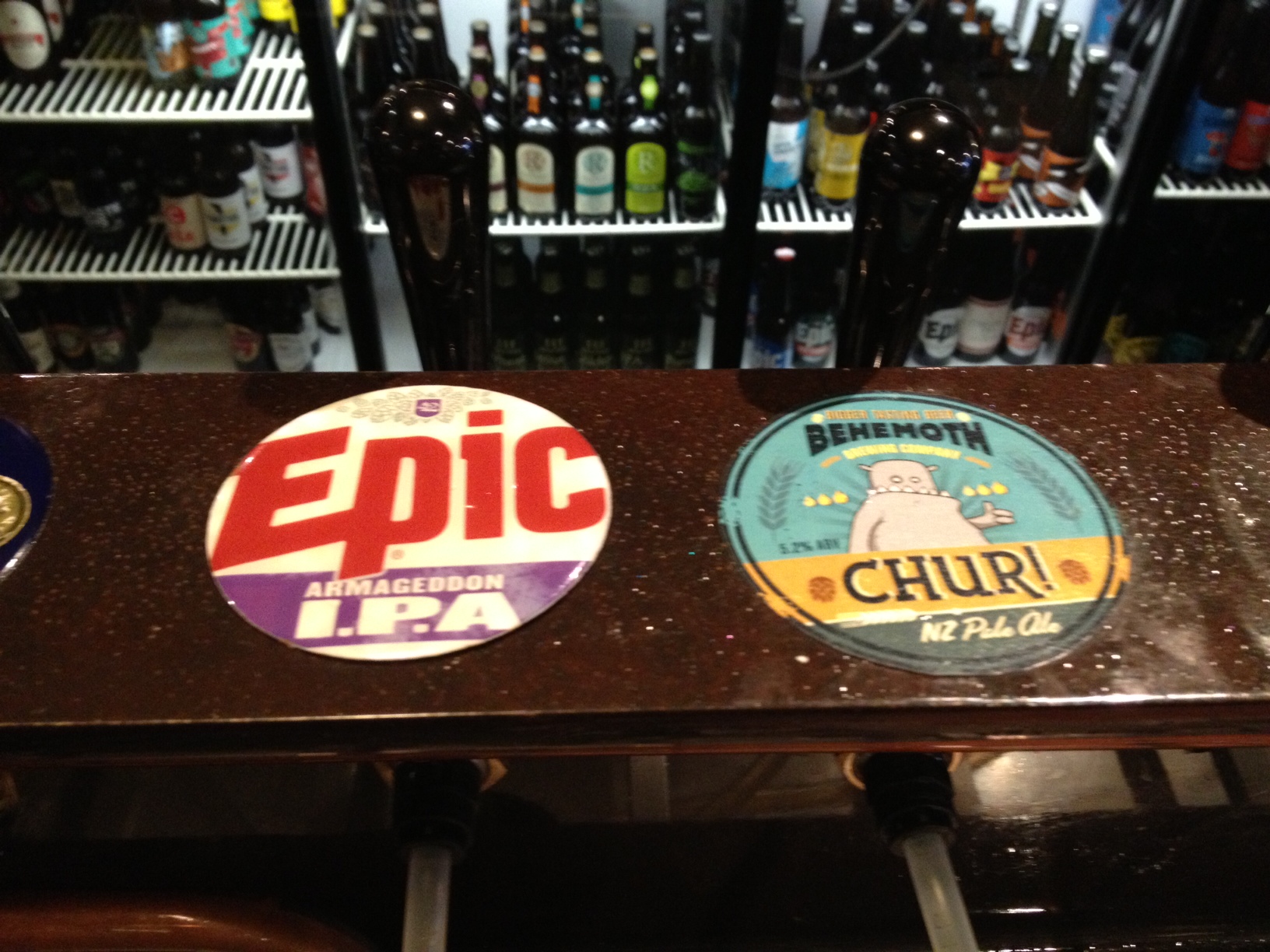 They had a great selection, including yet more breweries I’d not even heard of before: like Hot Water Brewing Co, a new outfit in the Coromandel (close to the famed, freaky Hot Water Beach) and Behemoth Brewing Company. We had a golden ale from each, Golden Steamer Ale and Chur. I had to have the latter as the label was cool; it was delicious too, even, crisp and fresh, sweet, bit of hop, resin. A really nice, balanced summer ale.