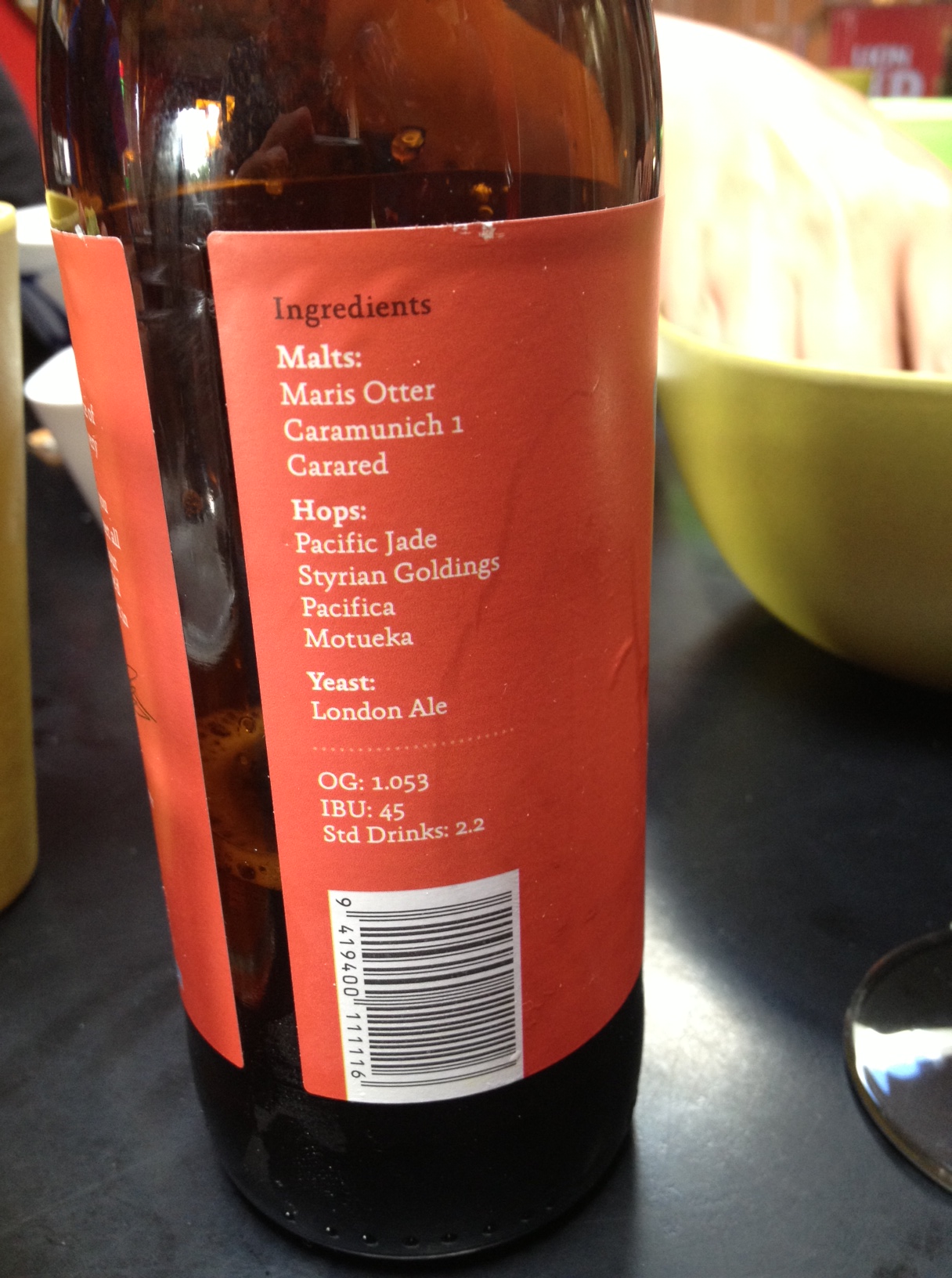 His Red IPA was his biggest success so far, and it was delicious. He called it a “bit of a muck about”, but this lovely dark amber beer is sharp and resiny smelling, and has a great balanced taste from dry hopping with Simcoe and Cascade hops and mellowing it with Gladfield malt from Canterbury.