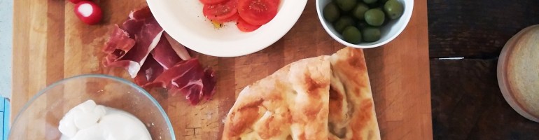 I’ve got a recipe here, but I’ll be honest – while I’m pleased with it, it’s never quite as good as the real thing, baked in a proper commercial oven oven, cut from a massive plank, eaten on a Roman street. Or nearby beach (where the old biddy, above, was our neighbour), here topped with some caciotta di pecora (sheep’s milk cheese) and prosciutto.
