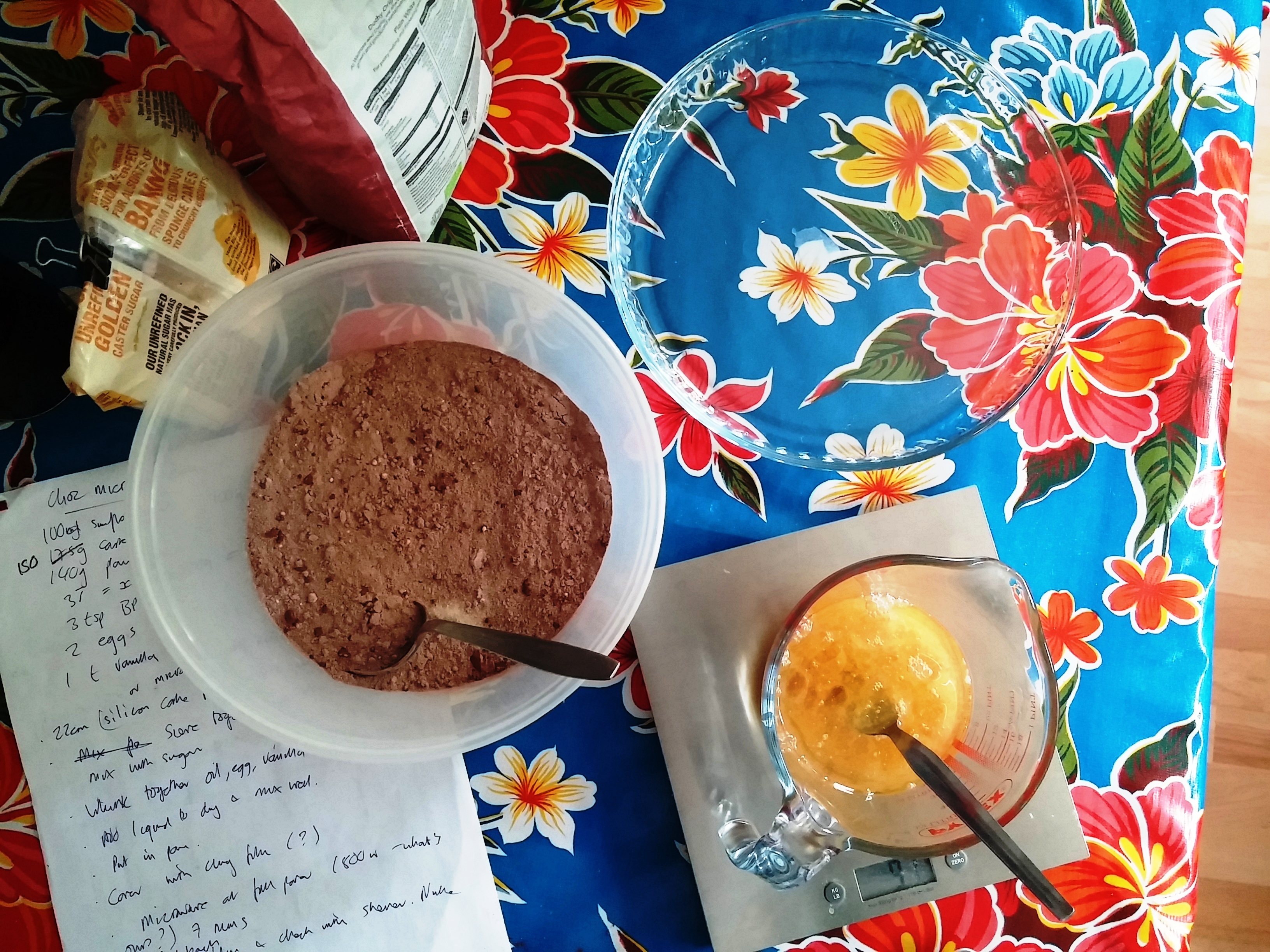 It’s not all good news though. What makes it not a good cake is a certain dryness, a weird airy homogeneity, a lack of depth of flavour and a slightly dry, ashy mouthfeel. Though the latter may be partly explained from the relatively high amount of baking powder in this recipe. Some jam and ganache, or even some standard water icing, might mask that, and compensate a bit for the dryness, but it’s definitely not as good as a real, proper, baked-in-an-oven cake. Nuking all the water molecules to cook the batter is no substitute for real heat.