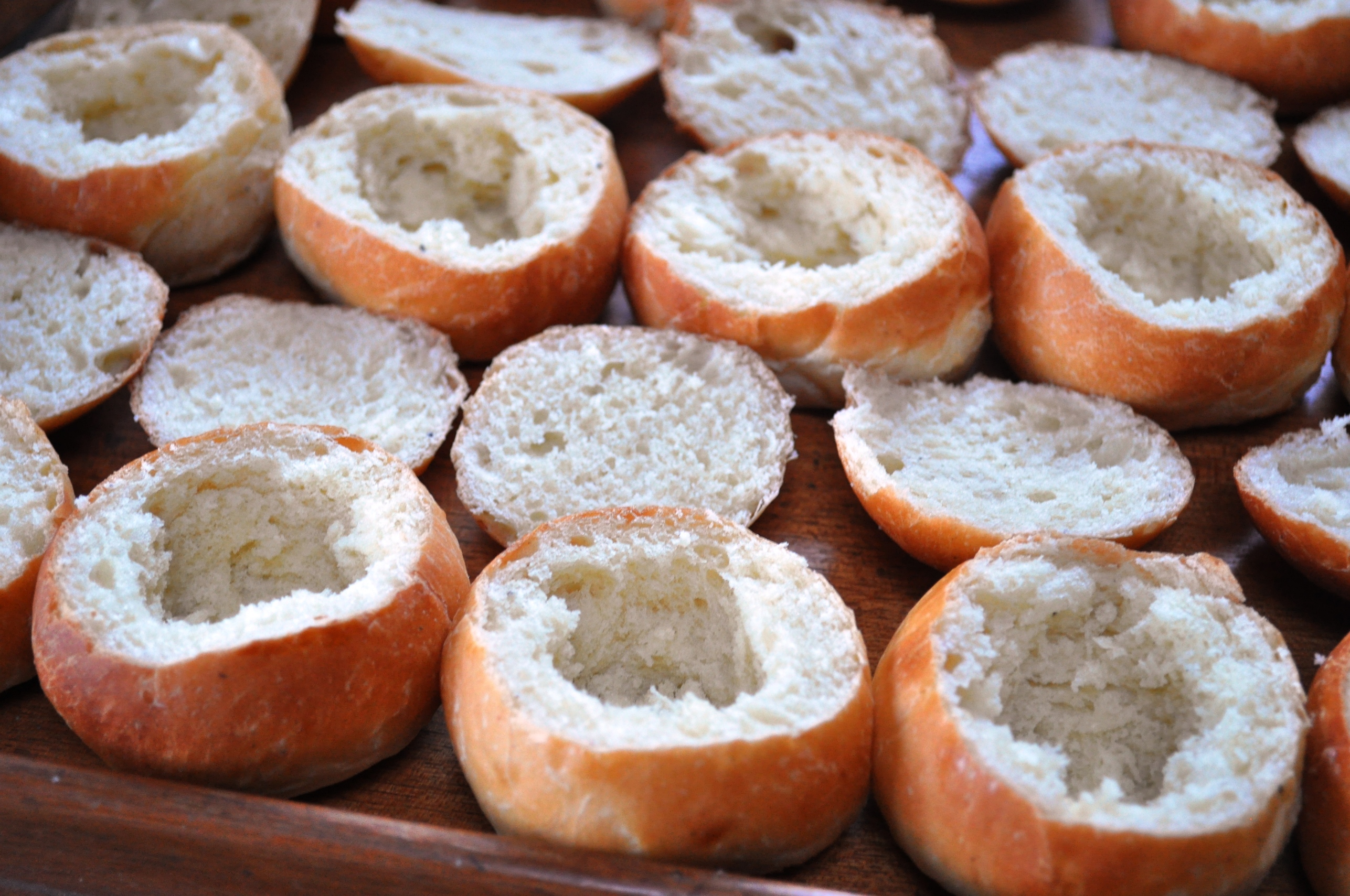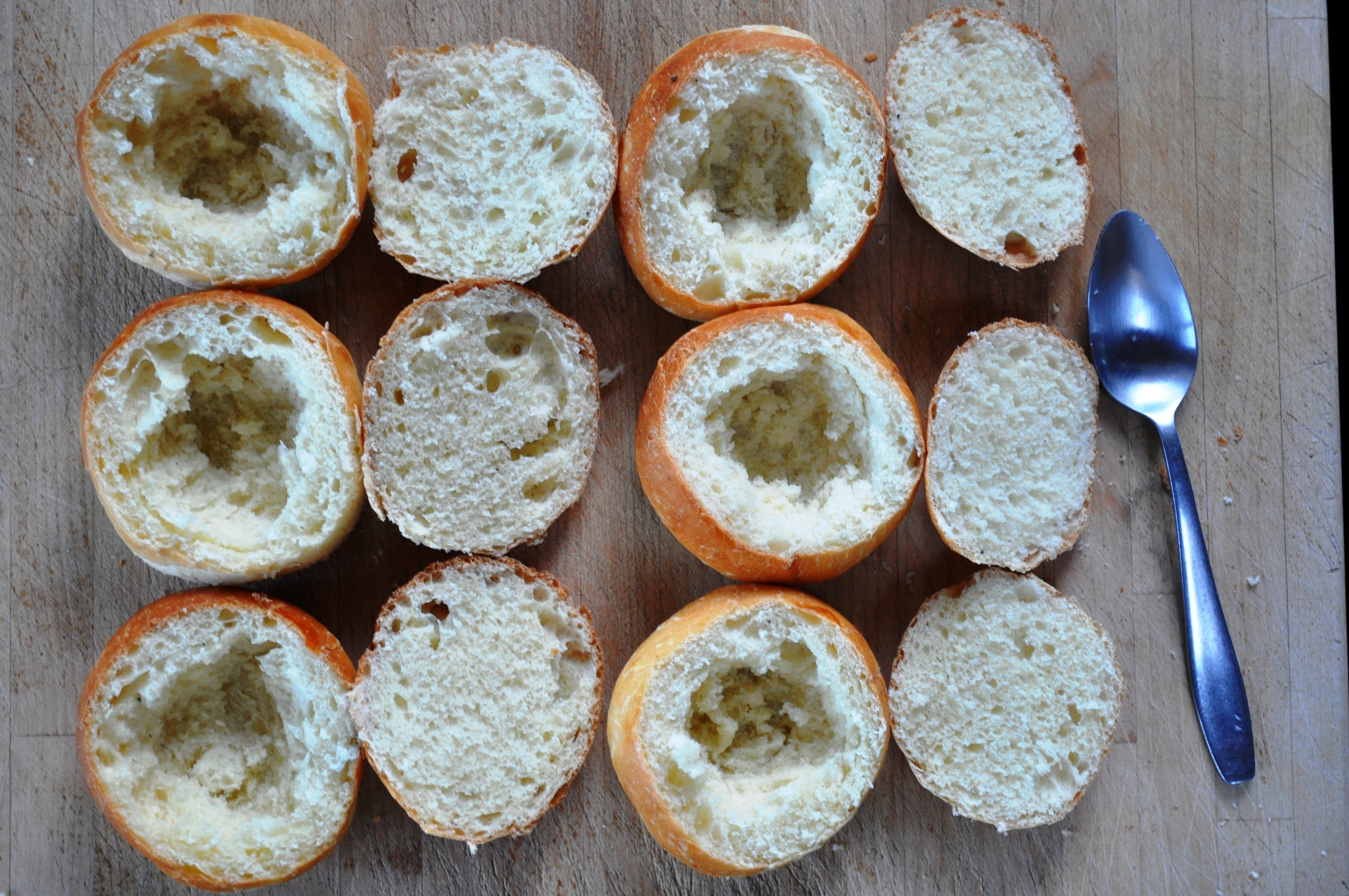 1. When the buns are cool, slice off the tops and scrape out some of the crumb with a fork or even a grapefruit spoon if you have such a thing. (I’ve got the remaining single one from a childhood set.) Put the crumbs in a bowl.