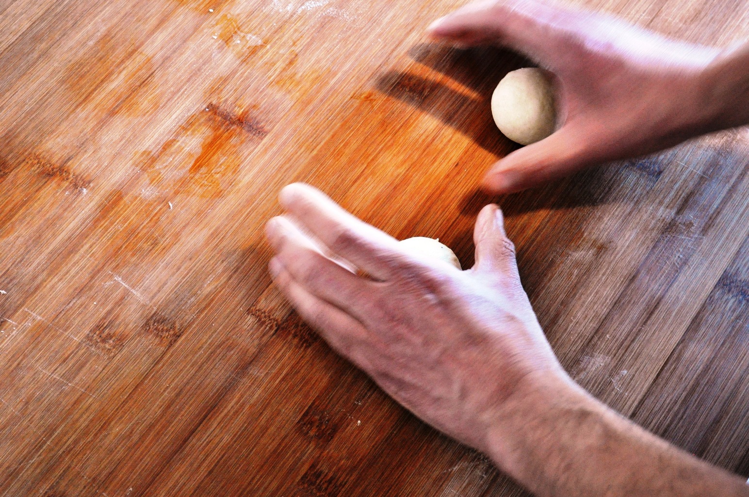 10. Form these pieces into neat balls. I do mine two at a time, rolling them inside cupped hands. This technique works best if your surface isn’t floury, so the dough sticks just slightly. Even better if your surface is stainless steel or marble. As mine is bamboo, I oil it slightly first, which also works well for wood work surfaces.