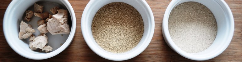 One of the awkward things about writing recipes for baked goods leavened with yeast is that there are three different types of yeast available commercially. Each has a slightly different quality, each is used in a slightly different way, and there are several different names to boot. It can make for some convoluted recipe ingredient lists.