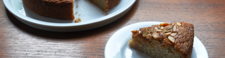 7. Put the mixture in the tin, scatter the 40g flaked almonds over the top. Place on a baking sheet (it may still leak some butter) then bake for about 1 hour, until a knife or skewer comes out clean. As long as the top’s not charring, it’s better to overbake this cake than underbake it. It’ll be more stable and the almonds and honey will keep it moist.