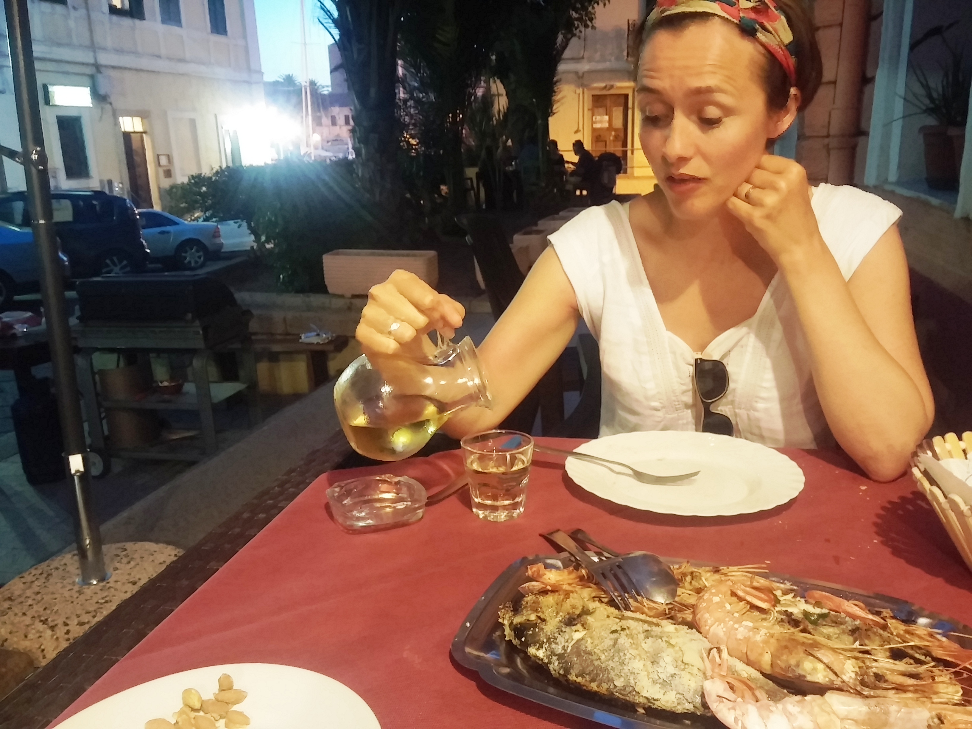 The pleasure of these meals was completed by being given a digestivo on both occasions – firstly mirto, then what Giorgio called “acqua sarda” – literally “Sardinian water”, but used in the same sense as eau de vie, the potent French “water of life”, or the Latin aqua vitae. Serious xenomorph blood, like grappa. Yowza.