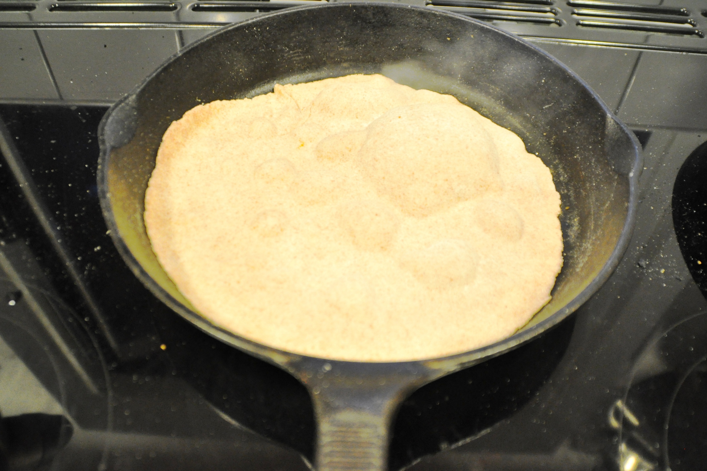 So I’m making my wheat tortilla; it’s pretty straightforward. Traditionally these would be made on a comal – an earthenware or cast iron flat griddle. As my kitchen isn’t equipped with a comal, I’m just using a heavy cast iron skillet. It means the tortilla aren’t that big, diameter-wise, but it’ll have to do.