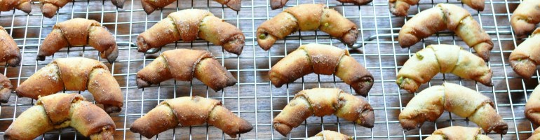 After Nadia’s death, I revisited those journals and transcribed more of the recipes. This is one of them. It’s called cinnamon pistachio crescents in my notes and it says it’s of Middle Eastern origin. I’ve no idea if it is a genuinely Middle Eastern recipe either, or the Arabic name of these pastries. They may well be related to croissants though, given the shape and the high butter content, so perhaps they’re a hybrid of Arabic food heritage and French imperialism. A terrible lack of information, I know. All I know is that they’re a bit like croissants, but there’s no lamination here, so they’re a lot easier to master. Perhaps they’re related to the Jewish rugelach. If anyone does know the name of Arabic pastries like this, please do enlighten me!*