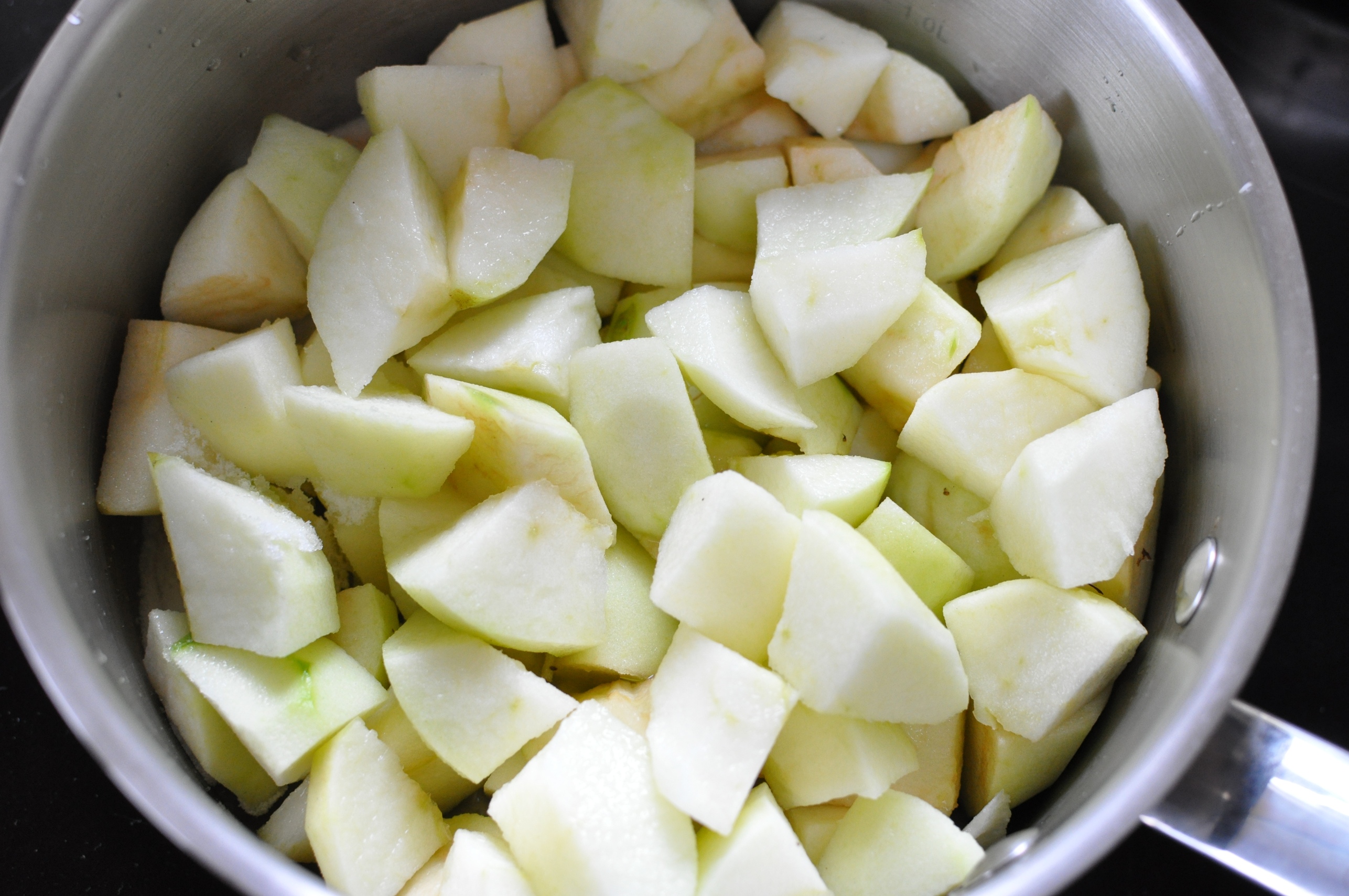 1. Peel, core and chop the apples into 2cm-ish cubes.