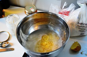 1. They combine the liquid into the flour working it on a work surface. I just used a bowl – flour, salt, then add the water, vinegar and the butter (which I allowed to cool a bit after melting). “When all the ingredients are well mixed, work the dough with the palm of your hand until it is completely homogenous, but not too firm.”