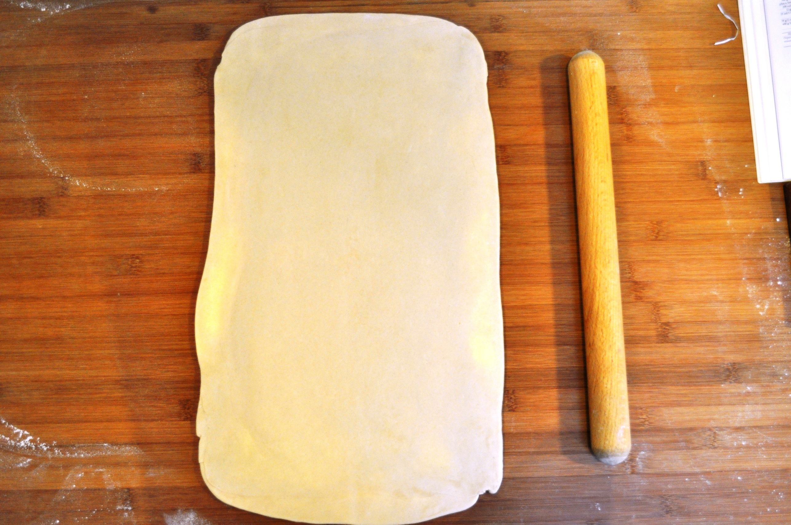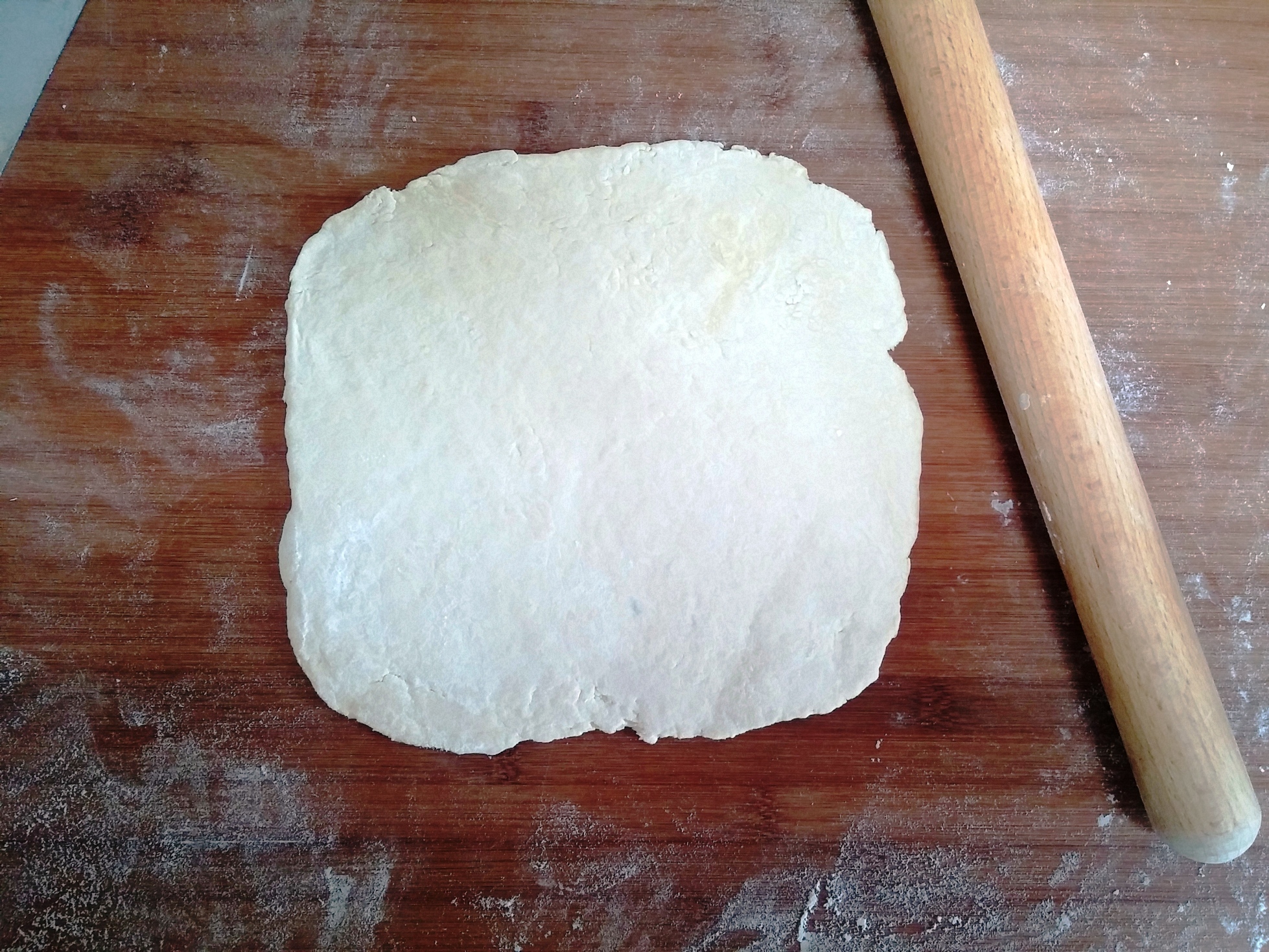 2. On a lightly floured work surface, roll it out. She says 15mm thick, which seems a bit thick considering the quantities. She doesn’t give any guidelines for how big a sheet of pastry you’re aiming for.