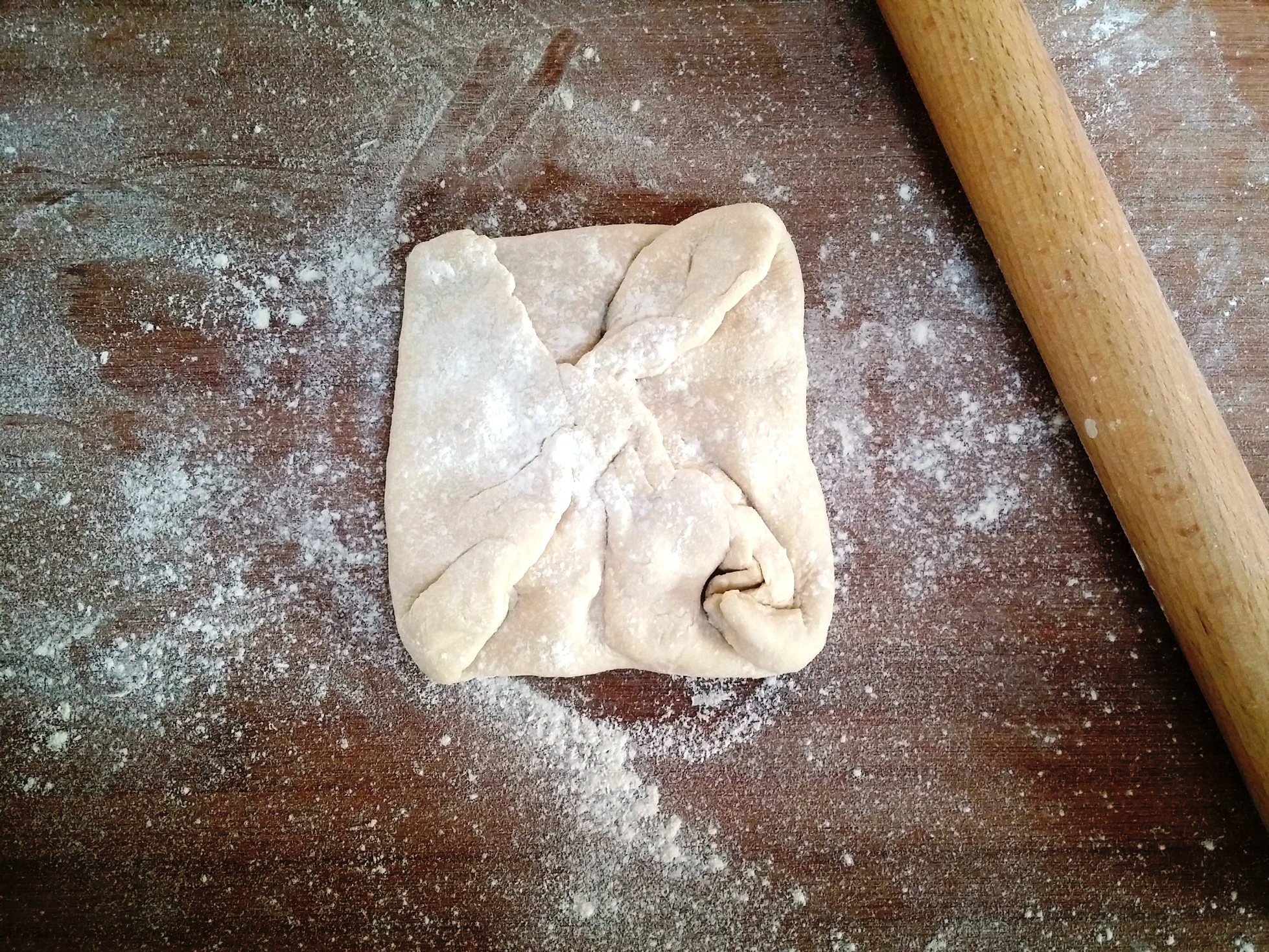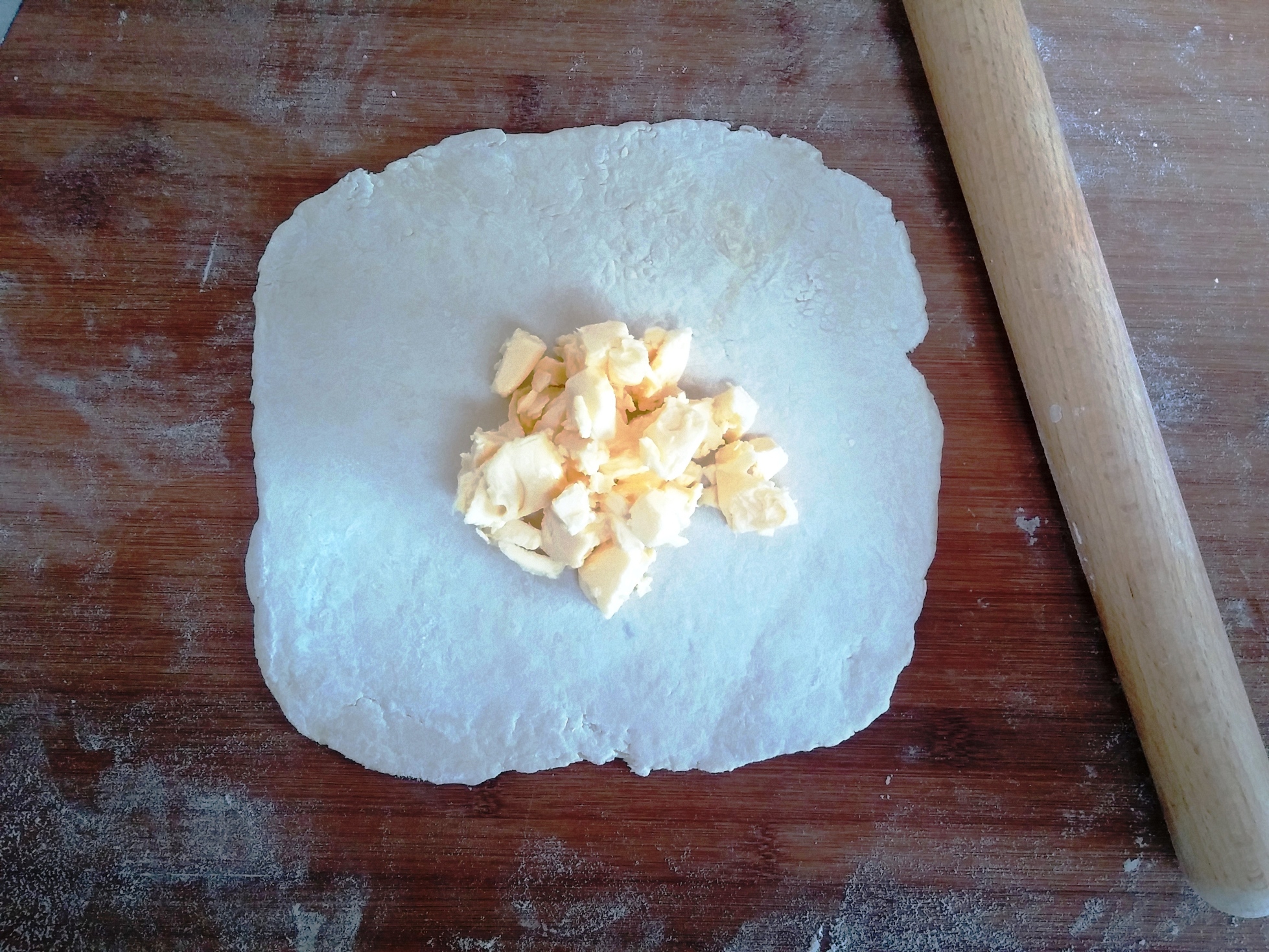 3. Add the butter to middle of the sheet “and fold over the flour corners” to enclose.