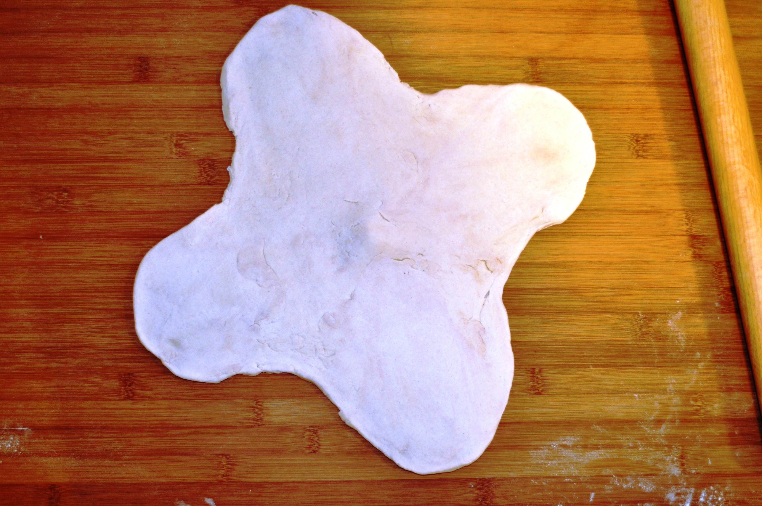 4. On a lightly floured surface, roll out – extending the quarters formed by the cut to create four ears, with a small mound in the middle.