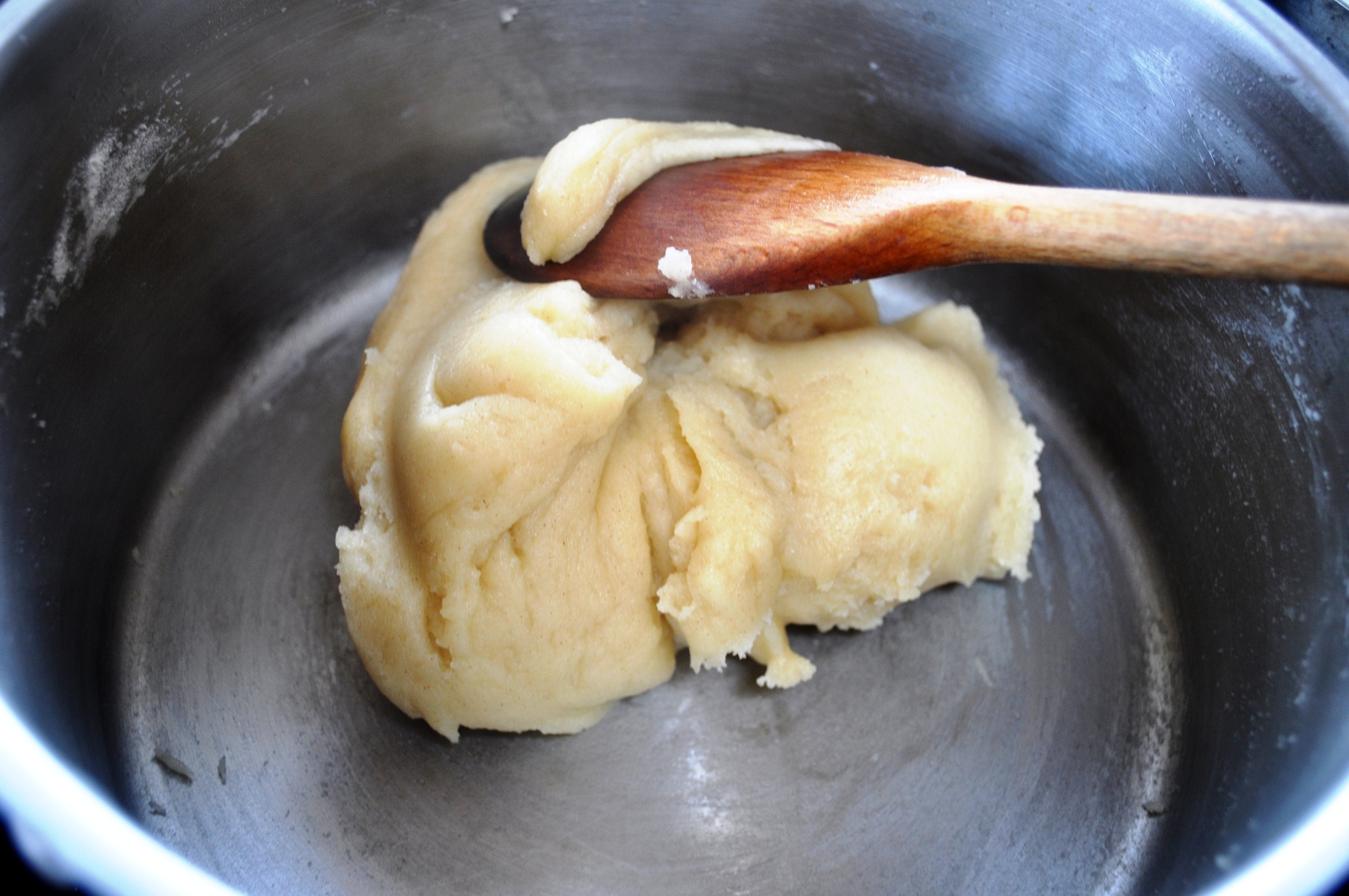 4. Keeping cooking the mixture, on a low heat, for a few minutes. This gelatinizes the flour, ie makes the mixture gelatinous and jelly-like – it shouldn’t be sticky, and should come away cleanly from the sides of the pan.