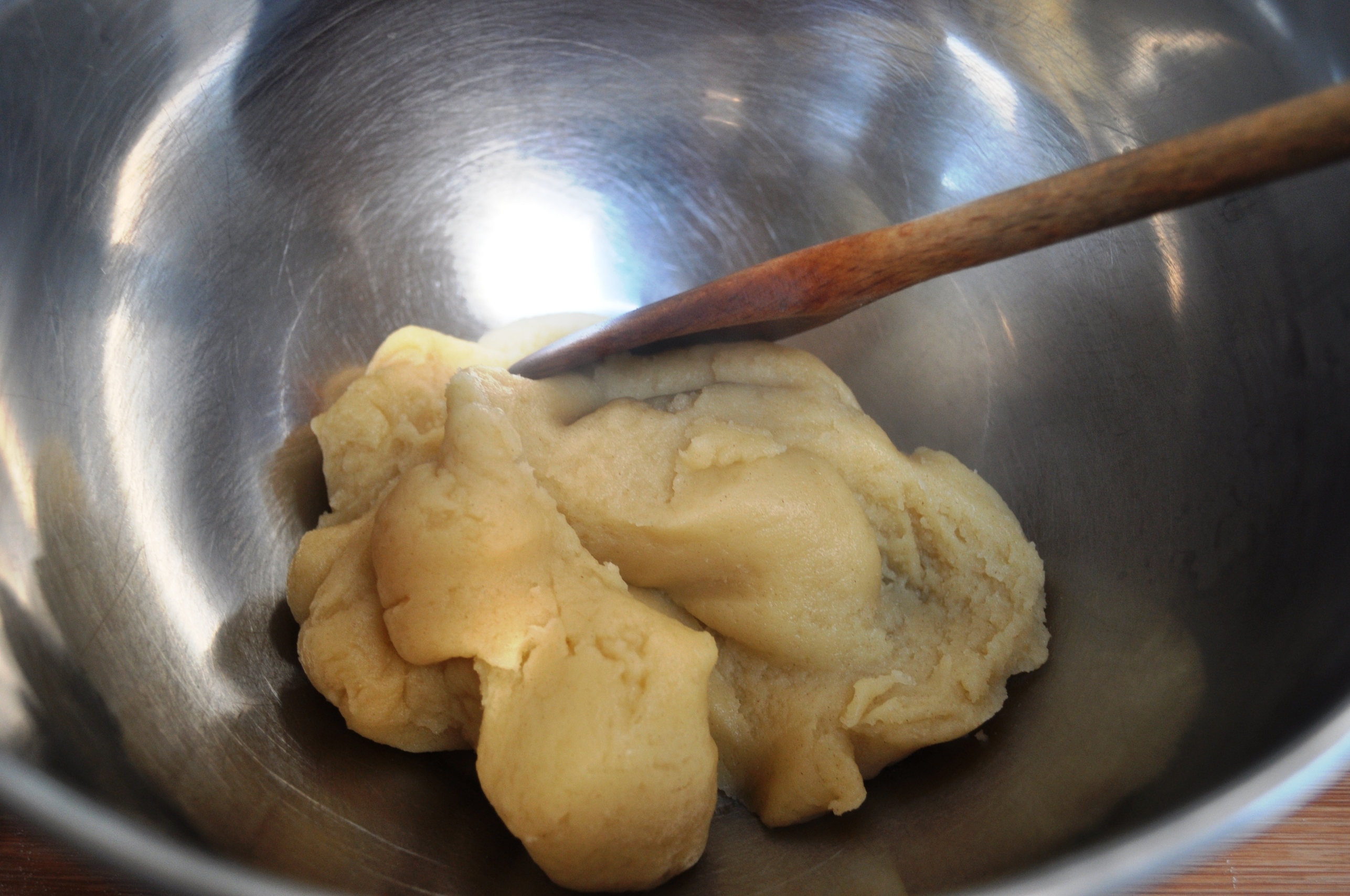 7. Beat in the egg slowly and gradually. Each time you add some egg, mix it in completely. You may not need all the egg (QB). You want a thick paste, not runny. If you have a mixer, that’s great for making this type of paste. Mix well.