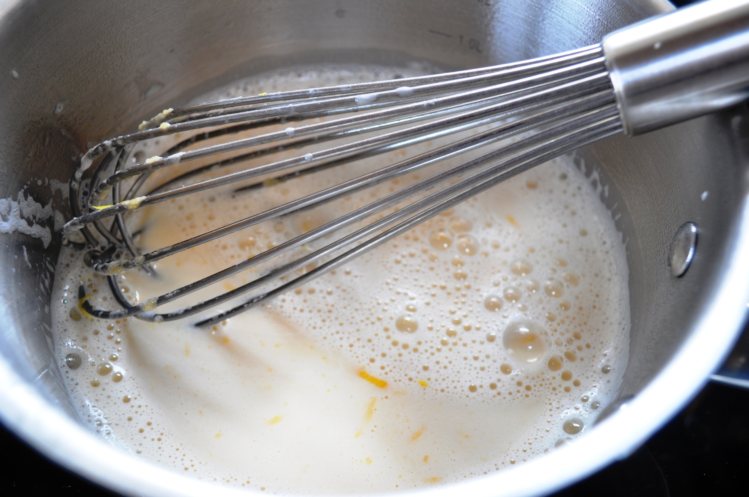 4. Allow the milk to cool slightly then pour it onto the egg mix, beating.
