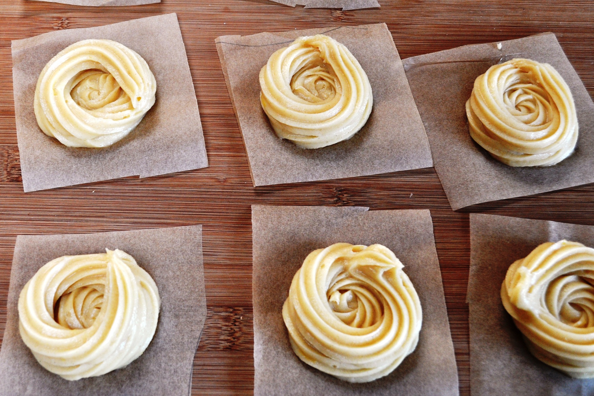 3. Pipe nest shapes onto the squares. The older type of zeppole was simply a ring, but as we’re adding crème pat to these, you need a middle – so start by piping a spiral, then build up a slight wall around the edge.