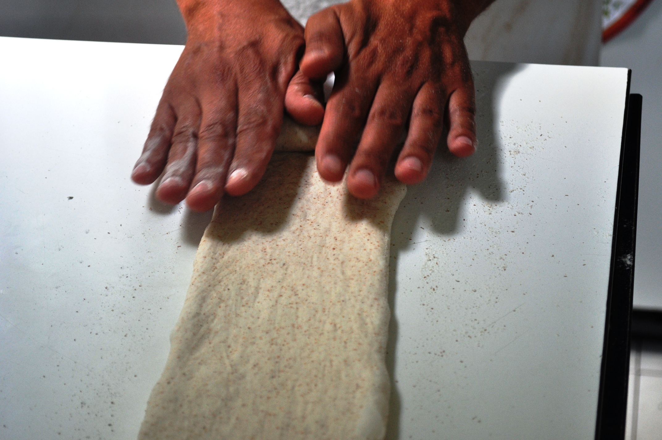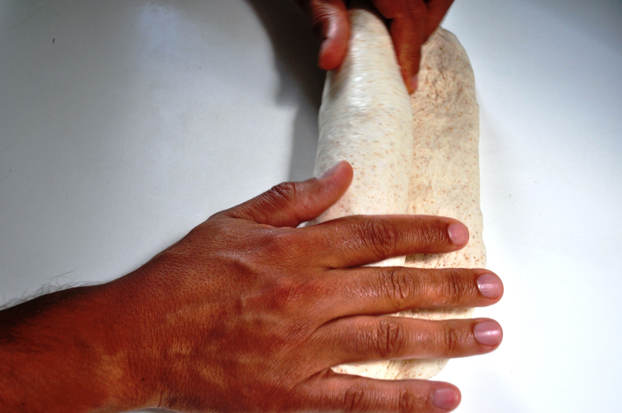 9. Turn the dough out again and you can now try giving it a stretch and fold. This is just another form of kneading. It’s good for trapping some more air in the dough, but it’s also about lining up the protein strands, the gluten orientation. It’s also a method that’s handy with wetter, higher hydration doughs like ciabatta. Just stretch the dough out, then fold in one end, then the other, as in these handy pics.