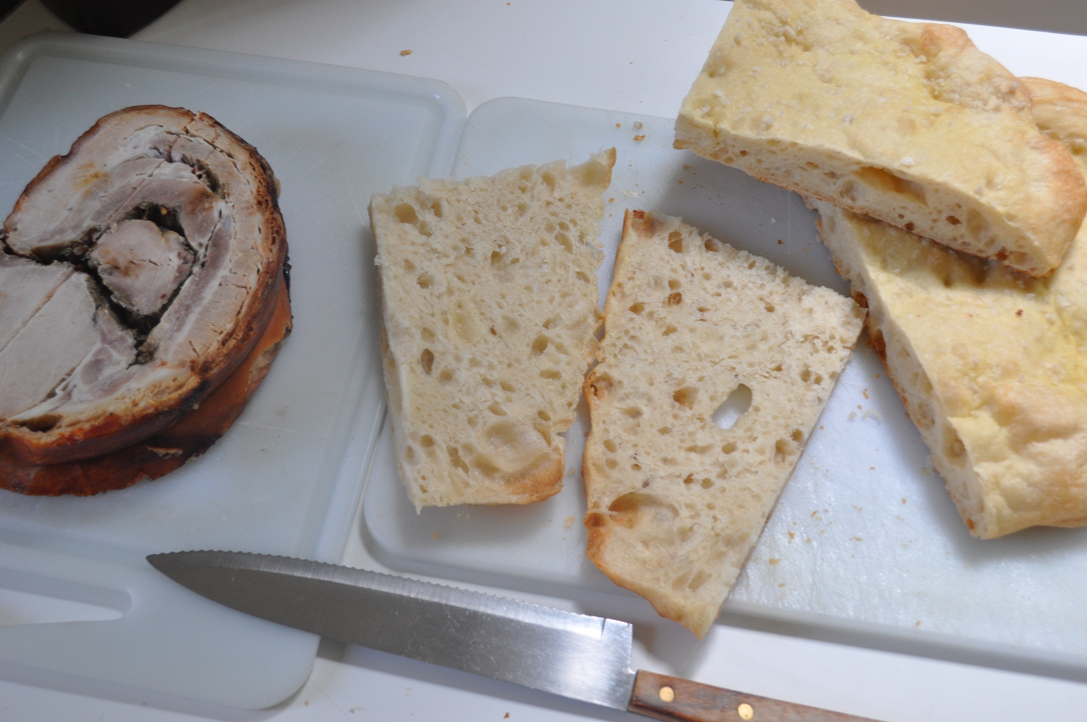 I’ve got a recipe here, but I’ll be honest – while I’m pleased with it, it’s never quite as good as the real thing, baked in a proper commercial oven oven, cut from a massive plank, eaten on a Roman street. Or nearby beach (where the old biddy, above, was our neighbour), here topped with some caciotta di pecora (sheep’s milk cheese) and prosciutto.
